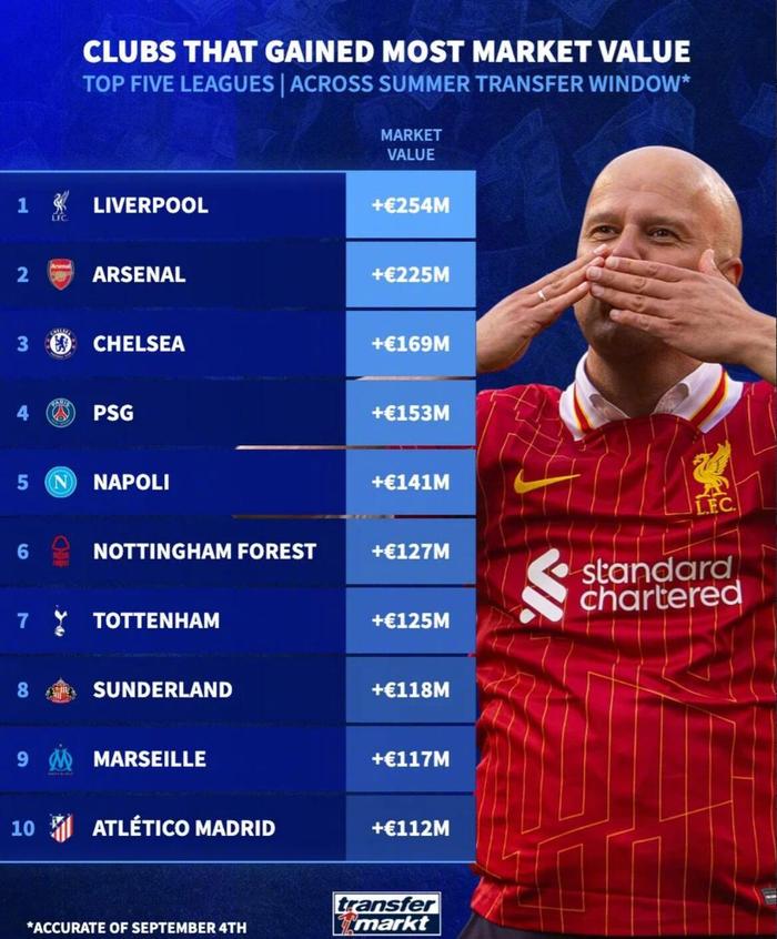 五大联赛的2025夏窗已经结束,德转统计了这个夏窗五大联赛球队身价涨幅的TOP10。