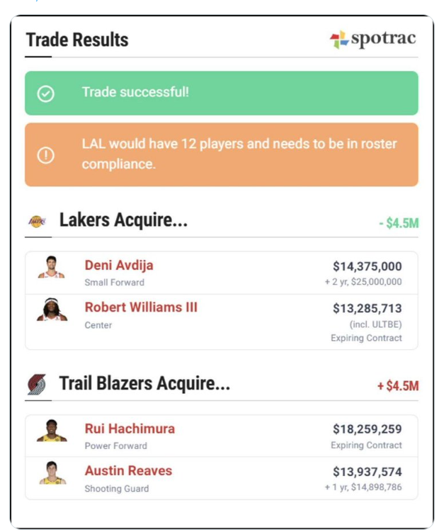 第二套方案是湖媒Laker Tom模拟,湖人用里夫斯、八村垒从开拓者换来罗威、阿夫迪亚。这笔交易湖人不仅得到首发中锋罗威,还得到了阿夫迪亚这位全能锋线,这符合湖人只愿意为了换取顶级内线才送走里夫斯的初衷。